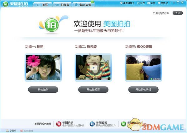《美图拍拍1.3.7》是一款自拍拍照工具;这款软件完美兼容所有主流摄像头,能够将电脑变成相机和DV,软件内还拥有超多可爱的素材,功能也非常丰富,操作也很简单,是一款非常不错的软件,有需要的小伙伴快来下载叭!