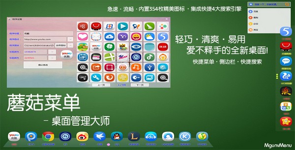 蘑菇菜单一款轻巧、简单易用的电脑桌面图标管理软件。提供快捷菜单、侧边栏、快捷搜索三大功能,让你的桌面更加整洁有序;同时软件内置了几百个精美的图标素材,可以帮助美化你的电脑桌面,支持特定的视图和各种插件方便你的使用,非常方便快捷,界面简洁,布局直观清晰,操作简单,容易上手,喜欢最新版的可以下载哦!