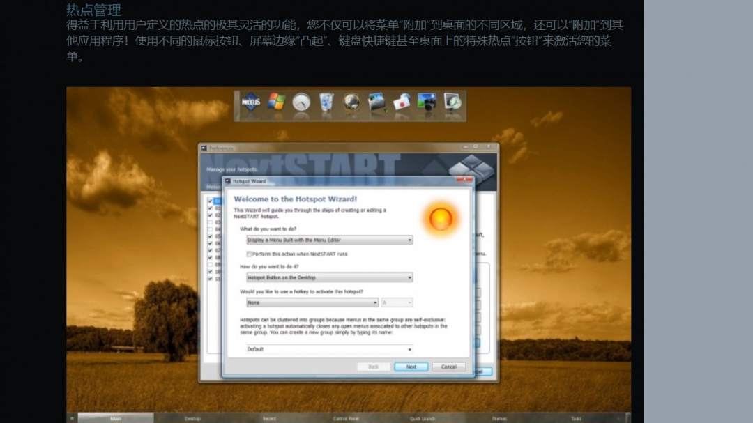 2、NextStart有3D界面功能集,并且可以隐藏桌面图标图标和任务栏,取而代之的是NextStart的工作菜单,可以编辑自己喜欢的风格、颜色、Titlbar甚至主题(包括多套和桌布)。